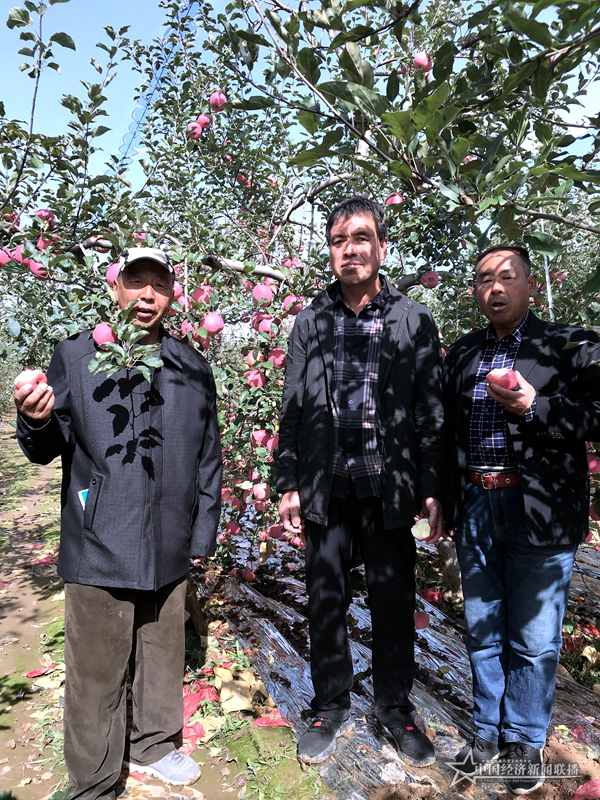 (前來參觀的果農(nóng)馮農(nóng)民和他的朋友品嘗“蝦肽”蘋果后都贊不絕口)