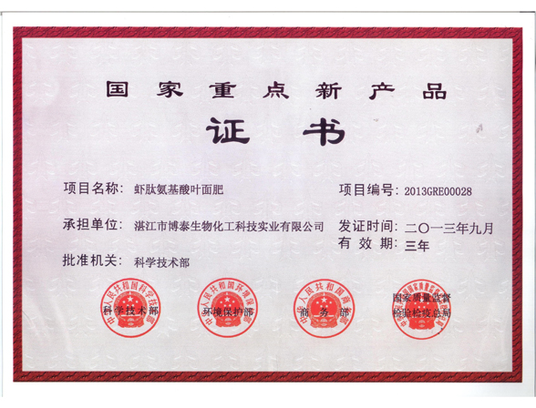 湛江博泰生物化工科技實(shí)業(yè)有限公司所研發(fā)生產(chǎn)的蝦肽氨基酸,是由28種動(dòng)物源(蝦頭蝦殼)活性氨基酸富含甲殼素、殼聚糖、殼寡糖、蝦特有的蝦腦磷脂、蝦紅素、活性鈣,氨基酸絡(luò)合的鎂、鐵、鋅、銅等中微量元素構(gòu)成的一種有機(jī)營(yíng)養(yǎng)免疫劑。由于蝦肽系列產(chǎn)品在種植過(guò)程中的特殊表現(xiàn),得到了廣大種植戶(hù)的強(qiáng)烈認(rèn)可。并在2013年9月被國(guó)家4部委聯(lián)合授予湛江博泰蝦肽肥為國(guó)家重點(diǎn)新產(chǎn)品證書(shū)。