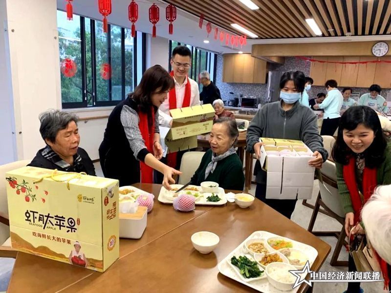 (廣東冠初味科技有限公司的員工給養(yǎng)老院的老人家發(fā)放蝦肽蘋果)